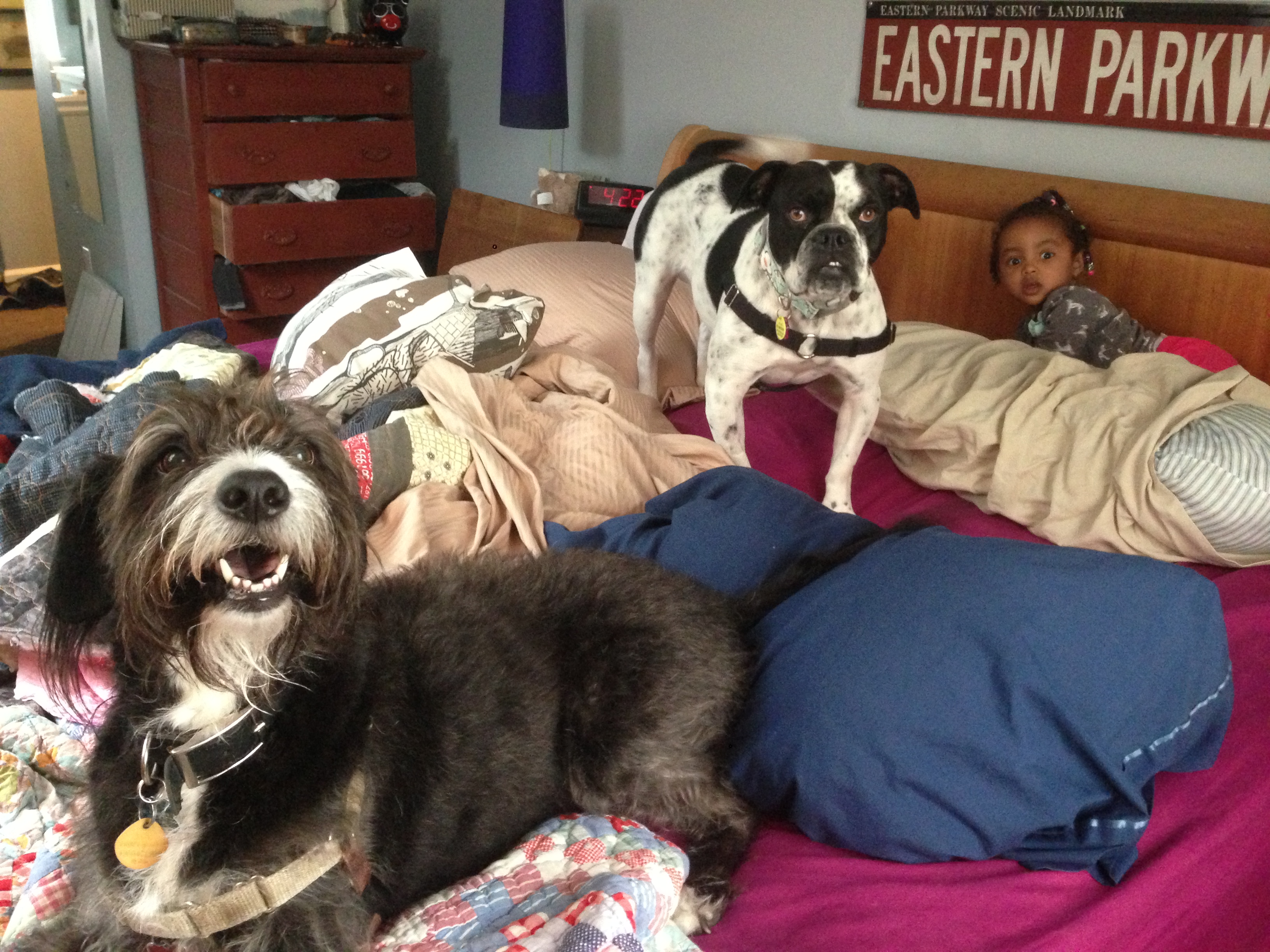 There is no longer hours of starring off into space, working herself up into a tizzy over how the light shifts when the trees blow. She is calmer. She is still herself. A sweet, giant, goofy dog whose tooth sticks out when she smiles. She still runs laps in our back yard, but this time its for real squirrels not imaginary ones (a mix of a bulldog and pointer makes for a very inellegent pointing technique). She is a not-so charming closet pooper and she does like to hop up on the dining room table and finsih our food. BUT,She sleeps with Davy every single night and happily puts up with her antics. She has learned to enjoy a good long pet and she can snore like the best of them. And this is her happy sound http://youtu.be/F_XaIuw6K6Q