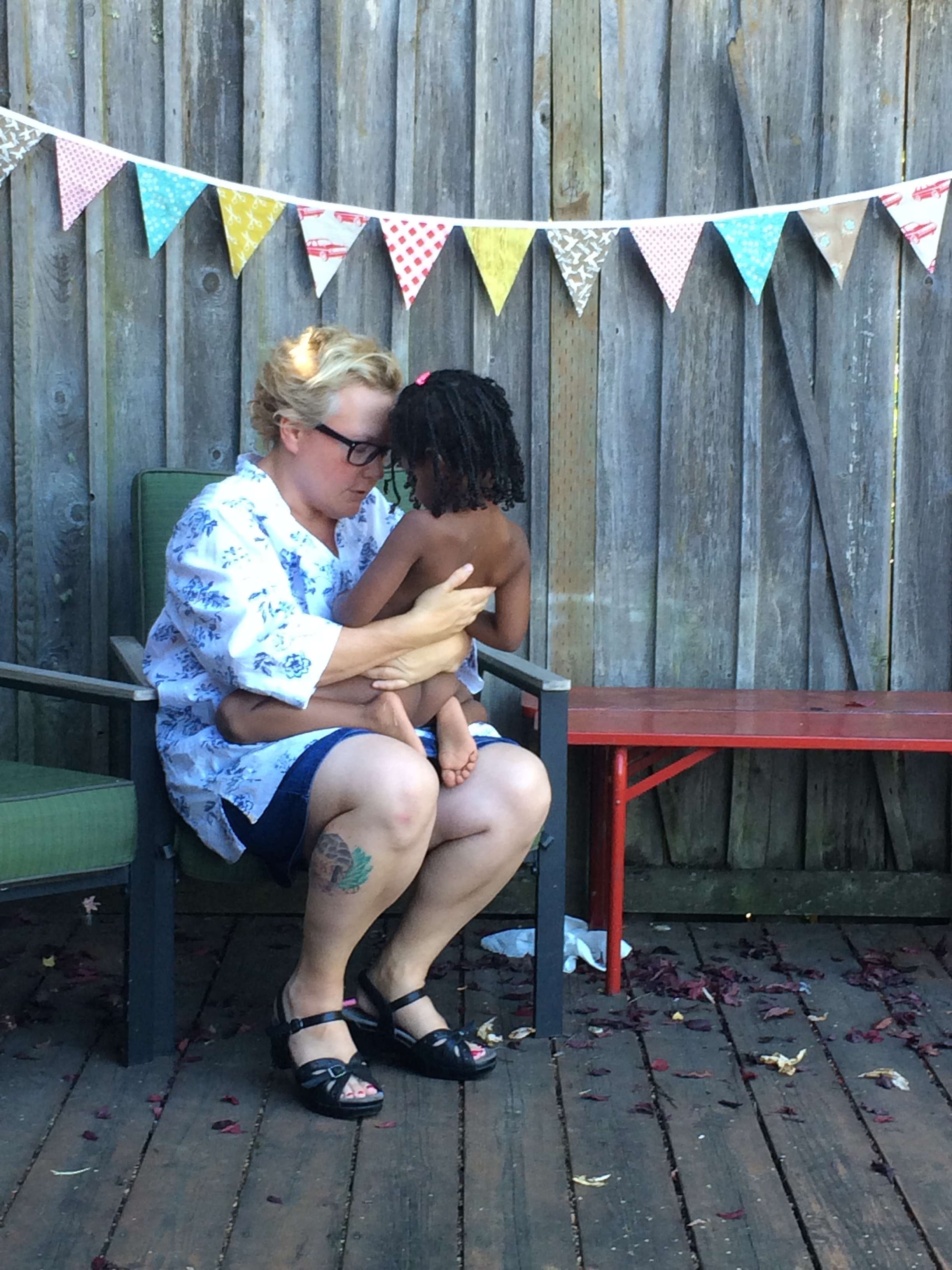 My friend Autumn took this photo of me least night. Our girls were playing and Mezmur had some tattoos she wanted to share. Davy wanted the tattoo with the purple sparkles that Mez had been saving for herself. Davy couldn’t have the tattoo and she started to cry, at first it was a vaguely fake cry of frustration. Sometimes it passes, and sometimes she forgets why she was so upset in the first place and just starts sobbing uncontrollably. That is what happened yesterday. I put Davy on my lap (she is naked because they were playing in the slip and slide) and tried to calm her down.